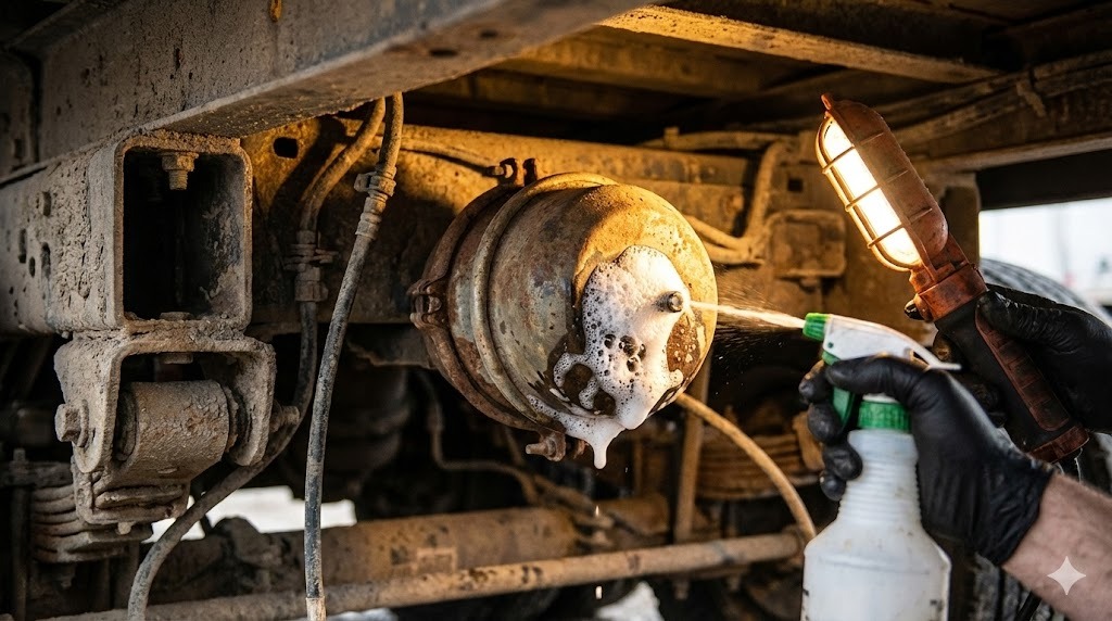Kỹ thuật viên đang dùng nước xà phòng kiểm tra rò rỉ khí nén tại búp sen 2 tầng trên rơ mooc.