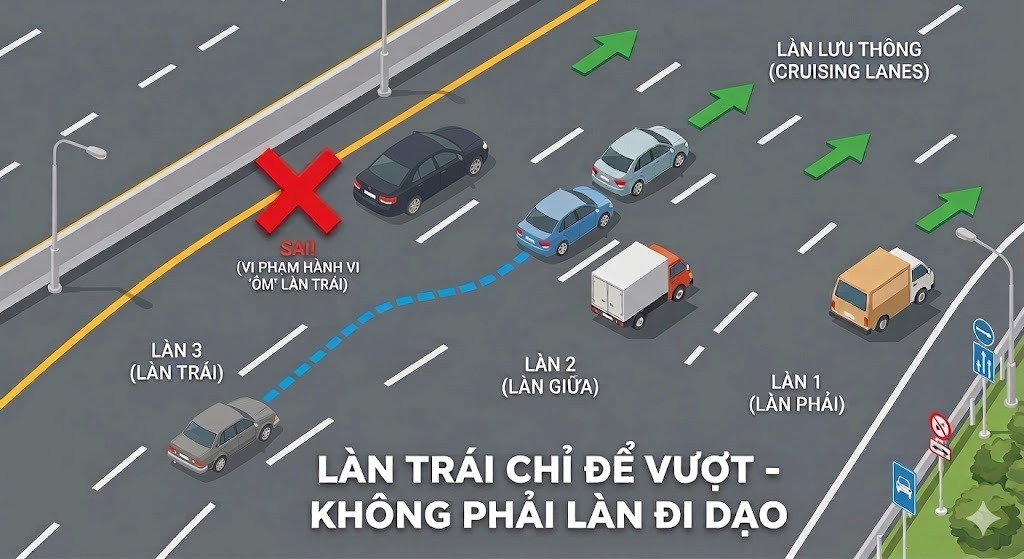 Ở tất cả các quốc gia có hạ tầng giao thông phát triển (như Đức, Mỹ, Nhật), làn trái cùng luôn được mặc định là "Passing Lane" (Làn vượt). Các xe lưu thông bình thường phải đi ở làn phải. Khi vượt xong, họ có nghĩa vụ xi-nhan và trở lại làn đường cũ. Chỉ có ở Việt Nam, khái niệm "làn vượt" mới bị phớt lờ.