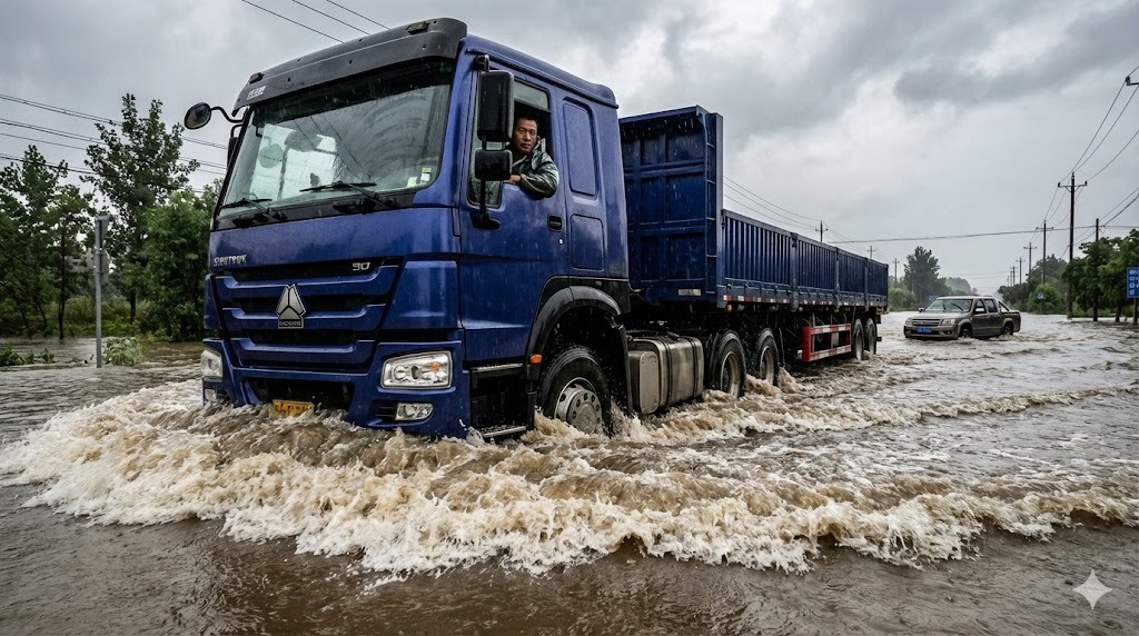 Xe tải đang di chuyển qua đoạn đường ngập nước sâu trong mùa mưa.
