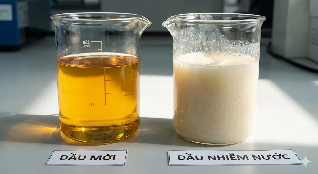 So sánh dầu cầu mới và dầu cầu bị nhiễm nước.