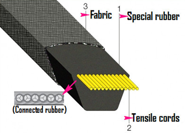 Sơ đồ mặt cắt minh họa cấu tạo dây curoa chữ V, gồm lớp cao su đặc biệt, lõi chịu lực (tensile cords) và lớp vải bọc.
