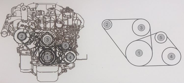 Sơ đồ minh họa đường đi của dây curoa trên động cơ xe tải/xe khách, dẫn động qua các puly chính (trục khuỷu, máy phát, bơm nước...).