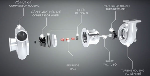 Sơ đồ chi tiết cấu tạo của turbo tăng áp, thể hiện rõ các bộ phận chính như vỏ nén, vỏ xả, cánh quạt tuabin, bạc và trục.