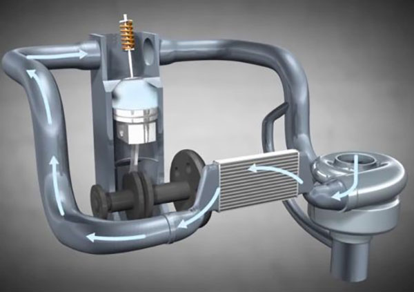 Sơ đồ 3D minh họa mối liên hệ giữa turbo tăng áp, bộ làm mát khí nạp (intercooler) và xi lanh động cơ để tăng công suất.